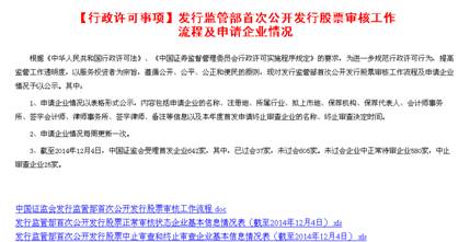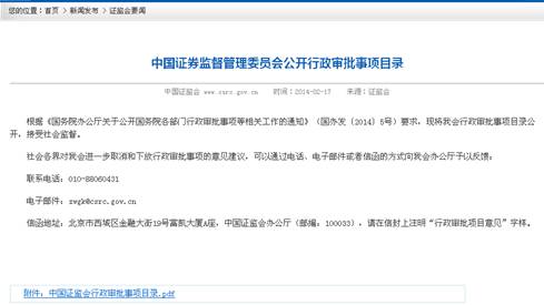 貫徹落實(shí)國務(wù)院有關(guān)工作要求,2014年2月17日在網(wǎng)站全面公開(kāi)中國證監會(huì )行政審批事項目錄,公開(kāi)的內容包括項目編碼、審批部門(mén)、項目名稱(chēng)、設定依據、審批對象,以及收集社會(huì )各界對進(jìn)一步取消和下放行政審批項目意見(jiàn)的具體方式等,接受全社會(huì )監督。發(fā)布發(fā)行審核委員會(huì )工作會(huì )議公告和審核結果公告201期。發(fā)布上市公司并購重組審核委員會(huì )工作會(huì )議公告和審核結果公告160期。公開(kāi)行政許可批復1282件。公開(kāi)首次公開(kāi)發(fā)行企業(yè)信息披露質(zhì)量抽查抽簽情況及監管問(wèn)答等17期、預披露及補充預披露企業(yè)877家次。對首次公開(kāi)發(fā)行股票、上市公司并購重組、證券投資基金募集、證券機構、基金管理公司、資信評級機構等的行政許可事項受理及審核進(jìn)度情況每周予以更新發(fā)布。