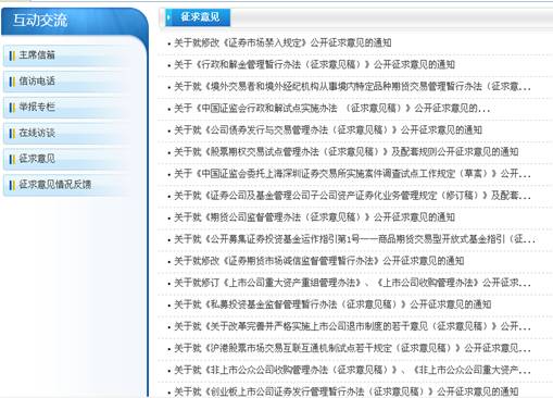 為提高政策法規制定的科學(xué)性和民主性,就《首次公開(kāi)發(fā)行股票并在創(chuàng )業(yè)板上市管理辦法(征求意見(jiàn)稿)》、《創(chuàng )業(yè)板上市公司證券發(fā)行管理暫行辦法(征求意見(jiàn)稿)》、《非上市公眾公司收購管理辦法(征求意見(jiàn)稿)》、《非上市公眾公司重大資產(chǎn)重組管理辦法(征求意見(jiàn)稿)》等18件部門(mén)規章和規范性文件,通過(guò)我會(huì )網(wǎng)站公開(kāi)征求意見(jiàn)。