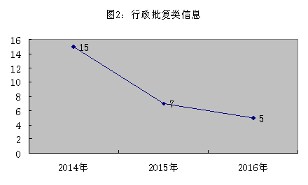 1.公開(kāi)信息突出監管工作重點(diǎn)。一是資本市場(chǎng)全面貫徹簡(jiǎn)政放權,行政批復類(lèi)逐年減少。行政批復類(lèi)信息2014年15條、2015年7條、到2016年減少到5條(見(jiàn)圖2)。二是體現資本市場(chǎng)依法監管、全面監管、從嚴監管。2016年主動(dòng)公開(kāi)行政監管措施4條,2014年和2015年這類(lèi)信息均為0。三是切實(shí)增強監管服務(wù)水平。我局公布的辦事指南類(lèi)信息逐年增多,2014年4條、2015年6條,到2016年則為9條。四是注重投資者保護工作。2015年和2016年投資者保護類(lèi)信息基本保持在15條左右。