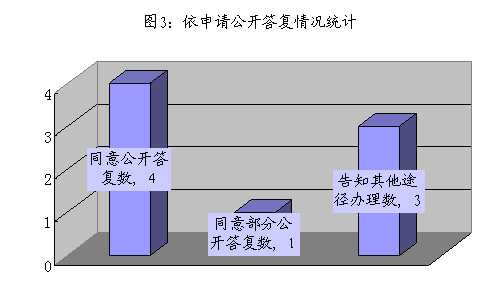 2016年,我局共收到信息公開(kāi)申請8件,全部為信函申請,均已按時(shí)辦結。其中,同意公開(kāi)答復4件、同意部分公開(kāi)答復1件、告知通過(guò)其他途徑辦理3件。各類(lèi)答復統計情況如下圖3: