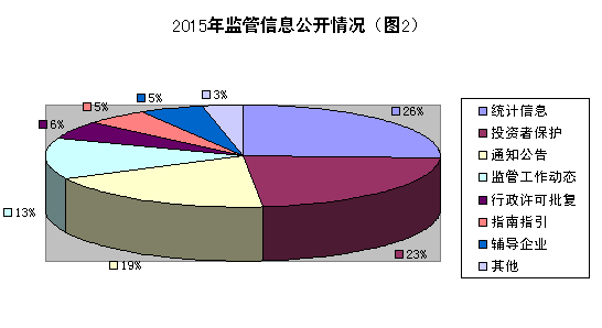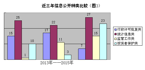 2015年主動(dòng)公開(kāi)信息中,統計信息類(lèi)30條次,占比25.4%;通知公告類(lèi)信息27條次,占比22.9%;投資者保護類(lèi)信息23條次,占比19.5%;監管工作類(lèi)信息15條次,占比12.7%;行政許可批復類(lèi)信息7條,占比5.9%;指南指引類(lèi)信息6條次,占比5.1%,輔導企業(yè)類(lèi)信息6條,占比5.1%;其他信息4條,占比3.4%。與近幾年相比,行政許可批復類(lèi)信息減少,監管工作動(dòng)態(tài)、投資者保護、統計信息、通知公告等監管服務(wù)類(lèi)信息明顯增長(cháng),詳見(jiàn)下圖2、圖3: