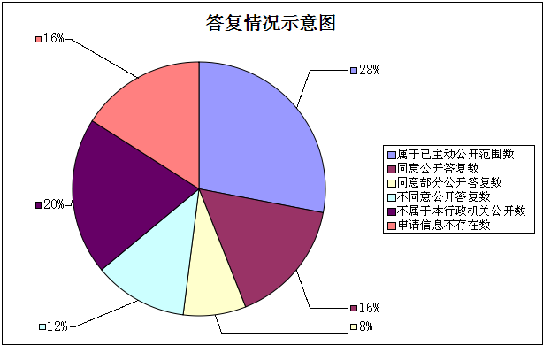 我局對收到的25件申請全部進(jìn)行了答復,其中,4件在法定期限內作出了答復,21件延期答復,延期答復主要原因為一次申請事項較多,涉及內容復雜。其中,屬于已主動(dòng)公開(kāi)范圍7件,占28%;同意公開(kāi)4件,占16%;同意部分公開(kāi)2件,占8%;不同意公開(kāi)3件,占12%,不同意公開(kāi)的理由為申請公開(kāi)的信息涉及商業(yè)秘密及個(gè)人隱私;不屬于本行政機關(guān)公開(kāi)的5件,占 20%;申請信息不存在的4件,占16%。