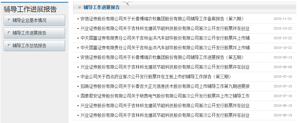 在“輔導企業(yè)信息”欄目發(fā)布信息49件。主要包括輔導企業(yè)基本情況、輔導工作進(jìn)展報告以及企業(yè)輔導備案信息等