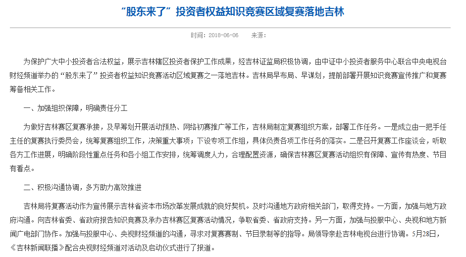 一是為保護廣大中小投資者合法權益,展示吉林轄區投資者保護工作成果,吉林局早布局、早謀劃,提前部署開(kāi)展知識競賽宣傳推廣和復賽籌備相關(guān)工作。經(jīng)我局積極協(xié)調,由中證中小投資者服務(wù)中心聯(lián)合中央電視臺財經(jīng)頻道在吉林成功舉辦了“股東來(lái)了”投資者權益知識競賽活動(dòng)區域復賽。