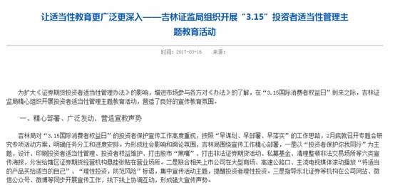 一是開(kāi)展“3.15投資者適當性管理主題教育活動(dòng)”。在“3.15國際消費者權益日”,吉林證監局精心組織開(kāi)展投資者適當性管理主題教育活動(dòng),營(yíng)造了良好的宣傳教育氛圍,使投資者適當性教育更廣泛更深入。