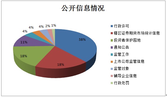 按照《條例》和《辦法》要求,我局主動(dòng)公開(kāi)的監管信息包括機構設置、工作職責、聯(lián)系方式、監管工作、監管對象、通知公告、行政許可、行政監管措施和行政處罰等信息;轄區證券期貨市場(chǎng)統計信息、輔導企業(yè)信息和投資者保護園地等。2017年,我局通過(guò)證監會(huì )網(wǎng)站主動(dòng)發(fā)布、更新各類(lèi)信息共141條,較2016年增長(cháng)了21%。其中,行政許可信息54條,行政處罰2條,監管工作6條,監管對象5條,統計信息26條,輔導企業(yè)信息3條,上市公司監管信息5條,通知公告15條,投資者保護園地25條。