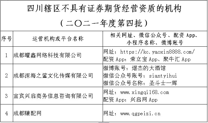 四川證監局公示轄區二〇二一年度第四批不具有證券期貨經(jīng)營(yíng)資質(zhì)的機構名單