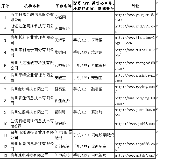 經(jīng)核實(shí),上述機構不具備證券期貨經(jīng)營(yíng)業(yè)務(wù)資質(zhì)。浙江證監局提醒廣大投資者:未經(jīng)批準,任何單位和個(gè)人不得經(jīng)營(yíng)證券期貨業(yè)務(wù)。請廣大投資者提高風(fēng)險防范意識,拒絕高額收益誘惑,遠離“股市黑嘴”“非法薦股”“場(chǎng)外配資”。